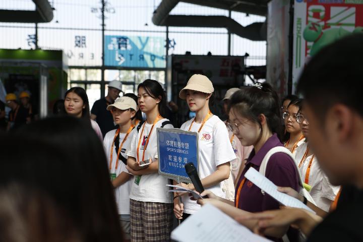 8月31日,在服贸会首钢园区体育服务专题展区内,来自北京体育大学的服贸会志愿者在参加培训。新华社记者陈朔摄