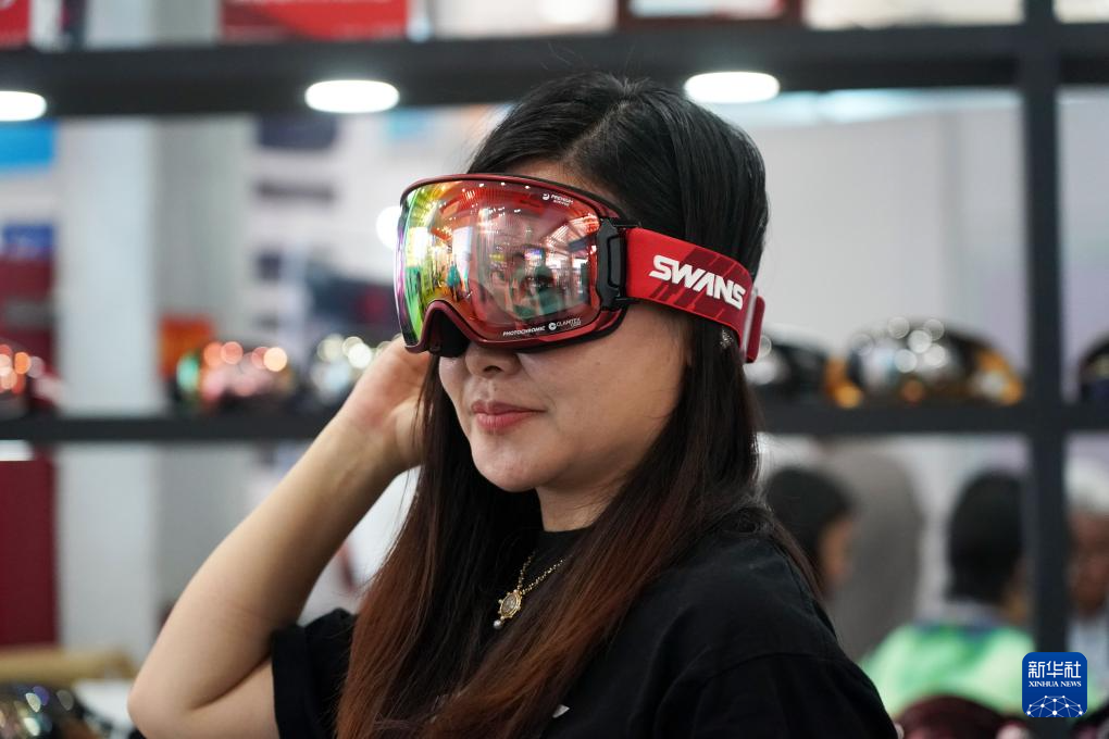 9月15日,观众在2023国际冬季运动(北京)博览会现场试戴一款滑雪镜。