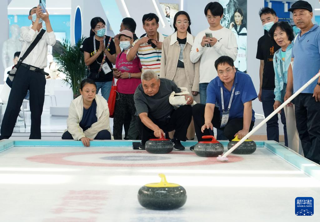 9月15日,观众在2023国际冬季运动(北京)博览会体验冰壶。