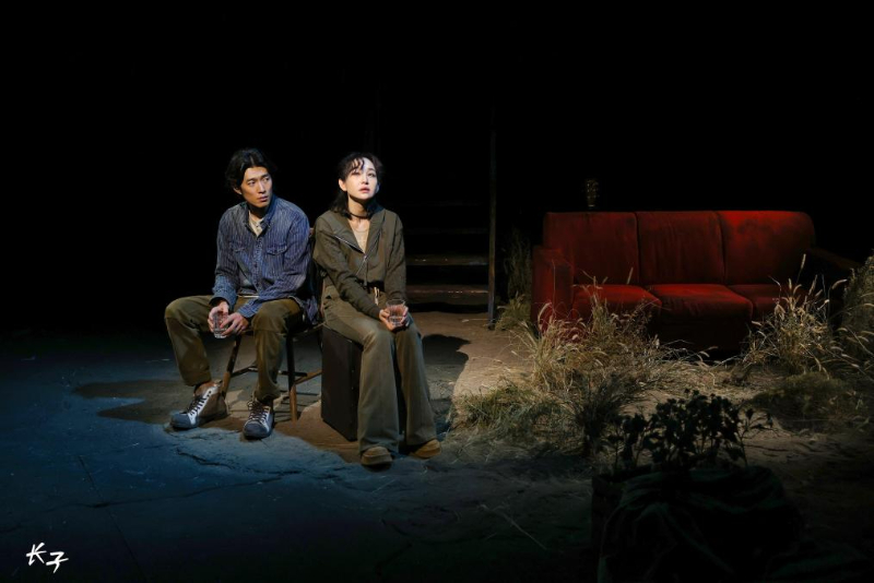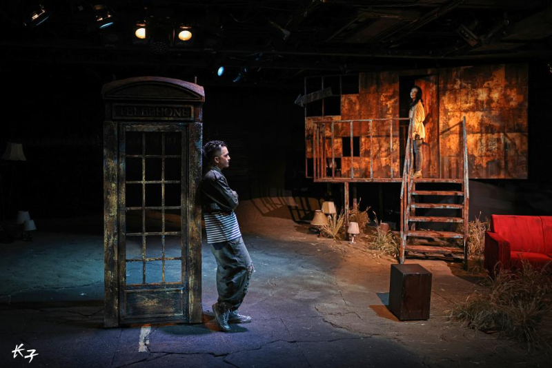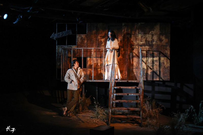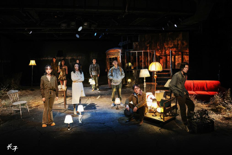 荒草丛生的舞台、破旧的电话亭、写满音符的黑板、随着剧情发展变换功能的红色沙发,配合色彩鲜明的灯光,营造出如同梦境般的超现实空间,表面荒芜的设计与人物内心的温暖形成强烈反差。