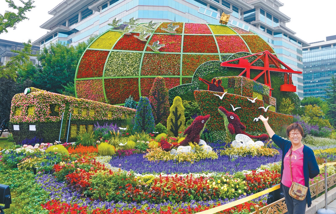 东单西南角“和平发展”花坛展现“一带一路”合作共赢的主题,吸引游客驻足。 记者 王海欣 摄