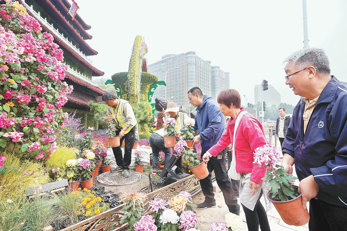 昨天,东四居民将亲手栽植的50盆菊花送到长安街边,摆进东单路口东北角的“文明华章”主题花坛,迎接论坛盛会。记者 王海欣摄