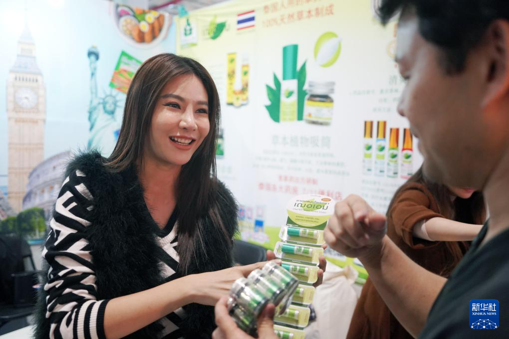 10月20日,来自泰国的参展商(左)向参观者推介泰国特色商品。
