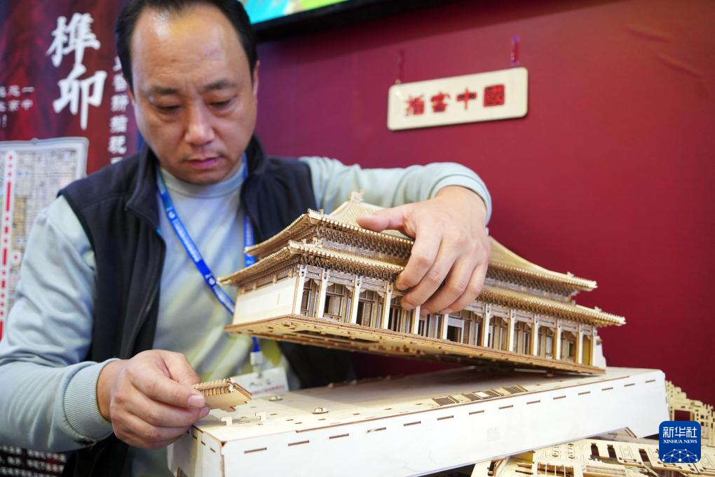 10月20日,“插客中国”的手工艺师在现场拼插榫卯结构木质故宫太和殿模型 。