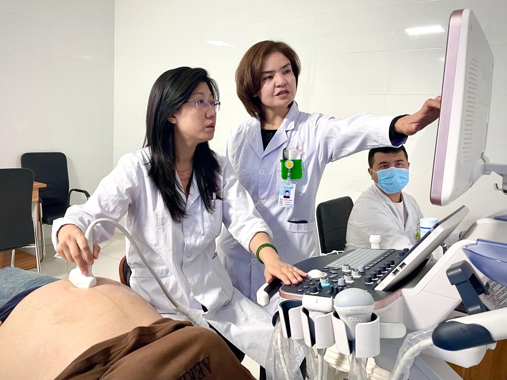今年5月,北京佑安医院超声科医生张嫄把诊室“搬到”北京援建的和田县人民医院新院区。诊室内,本地医生古海尔尼沙站在张嫄旁边,学习如何判断胎盘成熟度。