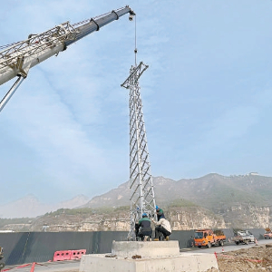 国网北京电力员工在房山十渡电网提升工程示范区组立窄基塔。李铮摄