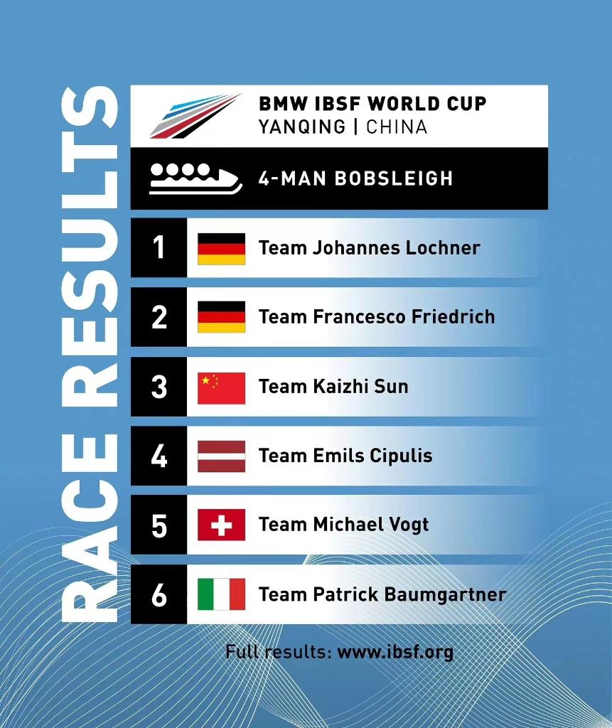 舵手孙楷智搭档甄恒、丁嵩和叶杰龙夺得宝贵的铜牌,为中国雪车队创造历史。另一组中国选手李纯键、魏鹏、朱自龙和匙翔宇与一组瑞士选手并列获得第七名。