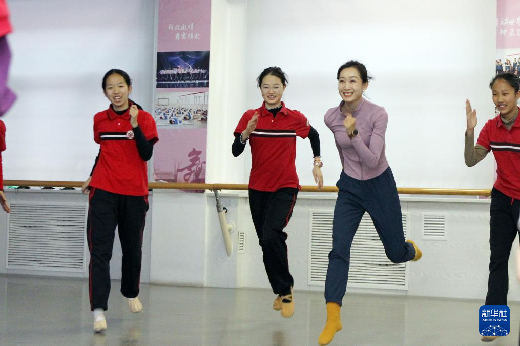 11月28日,北师大实验华夏女中舞蹈教师温馨(右二)在“心舞课堂”展示课上带领学生进行舞蹈热身,让学生借助舞蹈放松身心。