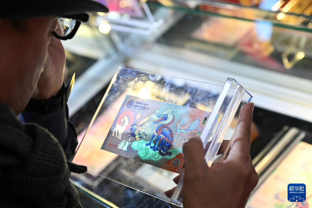 12月1日,一名参观者在博览会上观看在紫光灯照射下的丝路祥瑞纪念券。