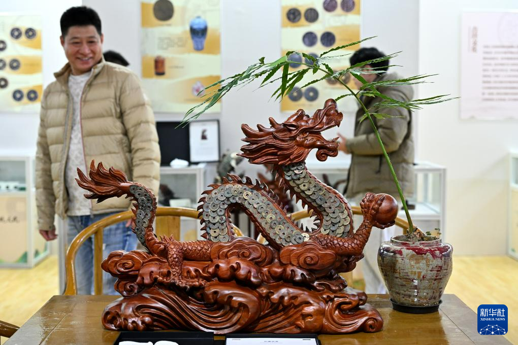 这是在中国钱币博物馆展台上摆放的用乾隆通宝制作的龙年文创艺术品(12月1日摄)。