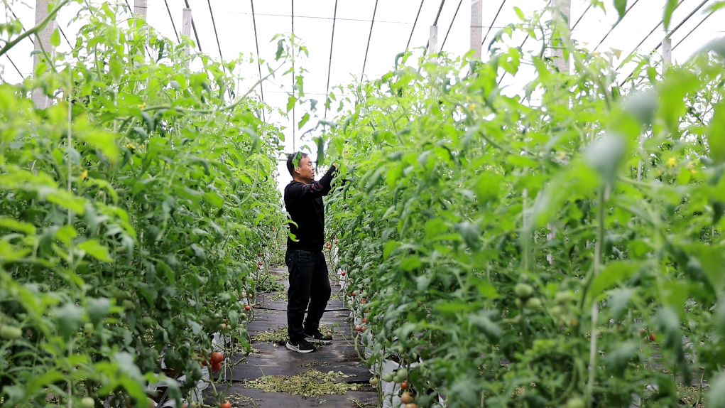 山东省寿光市稻田镇崔岭西村村民崔新中在棚内查看蔬菜长势。(寿光市委宣传部供图)