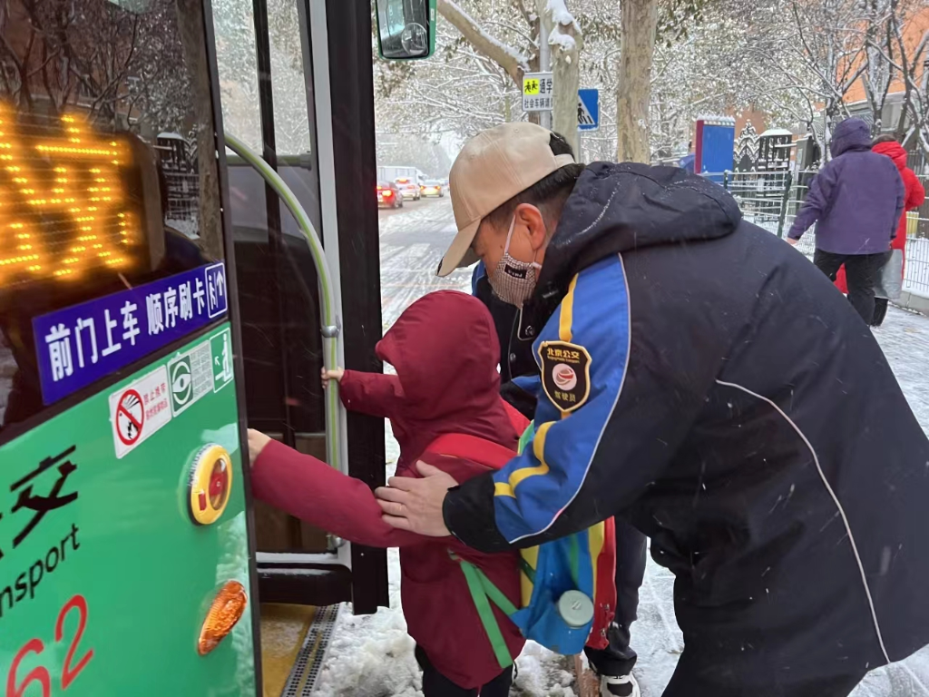 司乘人员护送小乘客登上北京通学公交车。(北京公交集团供图)