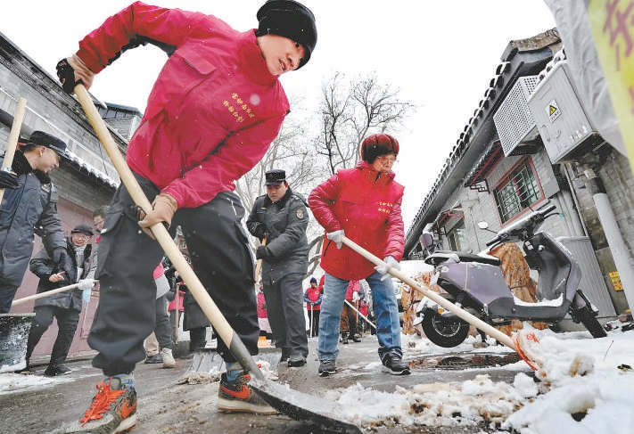 昨天下午,东城区安定门街道宝钞南社区“铃铛扫雪队”清除胡同积雪。记者 安旭东摄