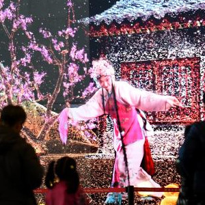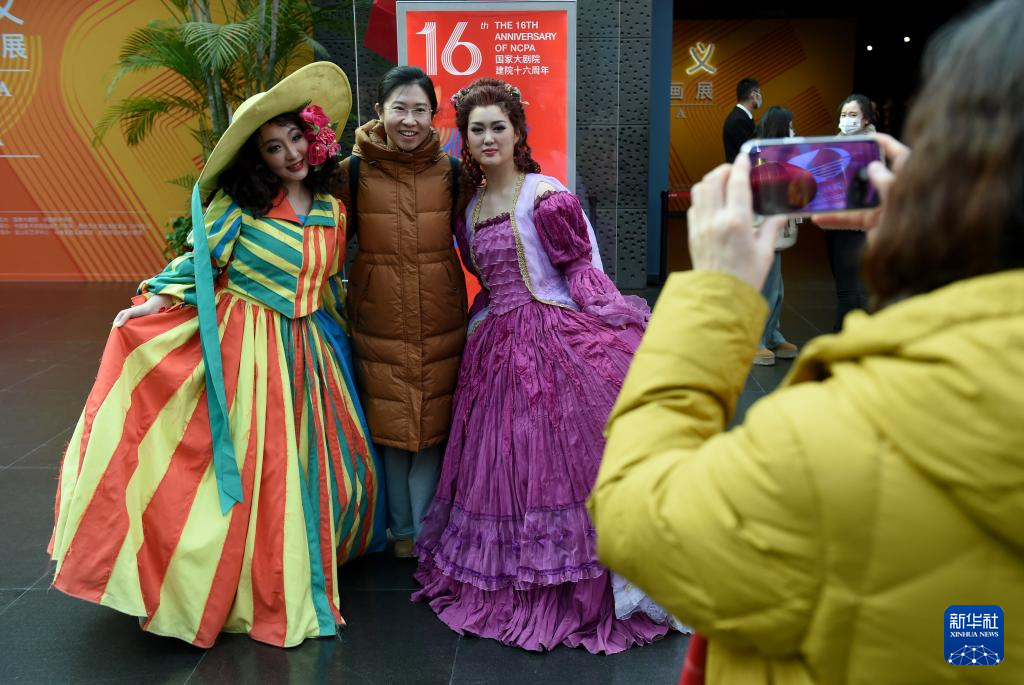 12月22日,观众在国家大剧院公共空间与身着剧目中舞台服饰的“剧中人”合影。