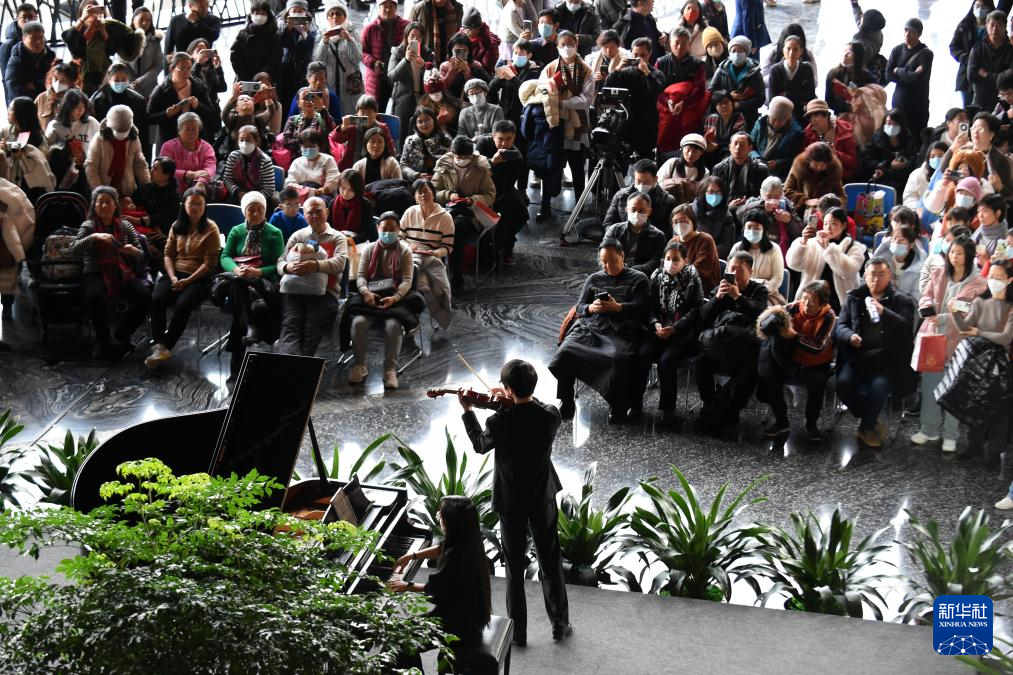 12月22日,观众在国家大剧院西咖啡厅前欣赏艺术家的小提琴与钢琴演奏。