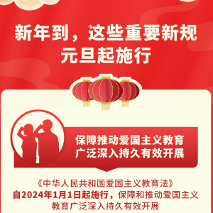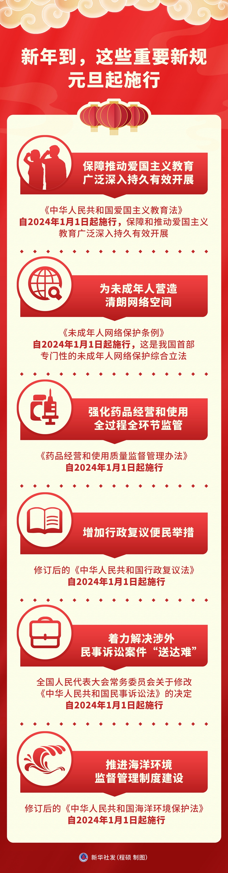 伴随着新年的钟声,一批重要新规自元旦起施行。以法治之力保障推动爱国主义教育开展,未成年人网络保护综合立法助力青少年健康成长,药品经营使用监管新规守护你我生命健康……全新的2024年,迎来法治新气象。