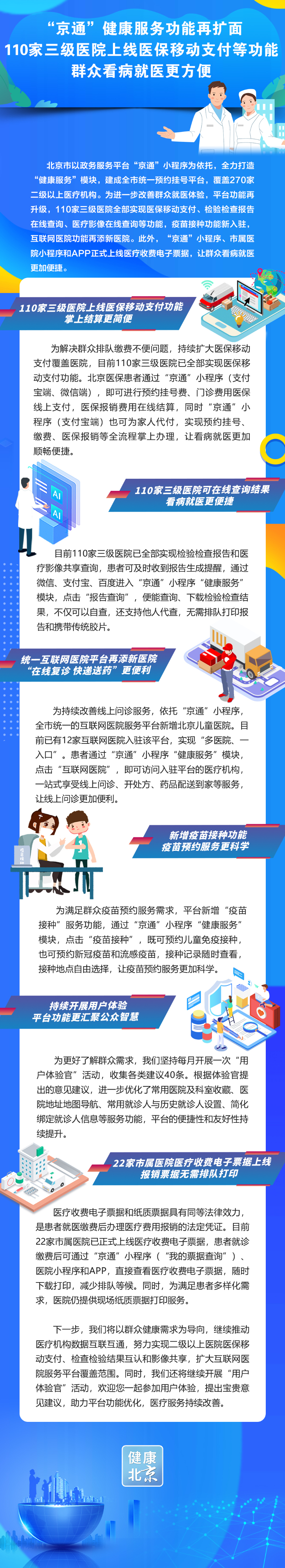 为进一步改善群众就医体验,“京通”小程序健康服务功能再升级,目前北京市110家三级医院全部实现医保移动支付、检验检查报告在线查询、医疗影像在线查询等功能,疫苗接种功能新入驻,互联网医院功能再添新医院。此外,“京通”小程序、市属医院小程序和APP正式上线医疗收费电子票据,让群众看病就医更加便捷。