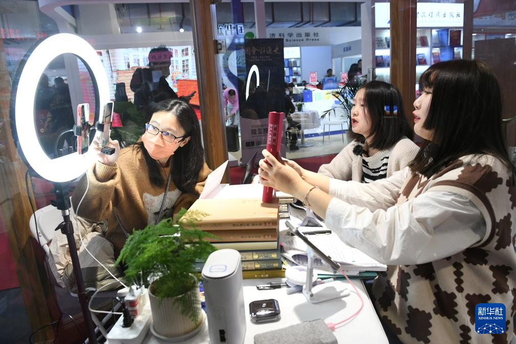 1月11日,一名参展商工作人员在订货会现场直播,通过互联网介绍书籍。