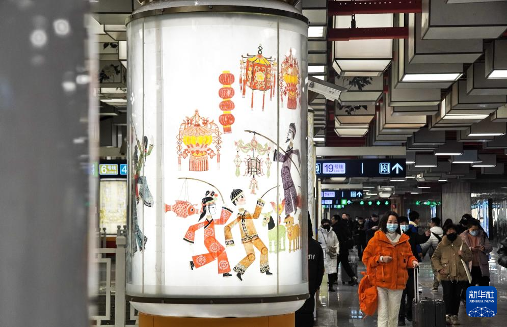 这是平安里地铁站内的中国传统皮影戏走马灯灯柱(1月20日摄)。