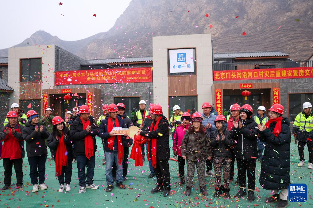 这是1月30日在北京市门头沟区沿河口村拍摄的灾后重建安置房交付仪式现场。