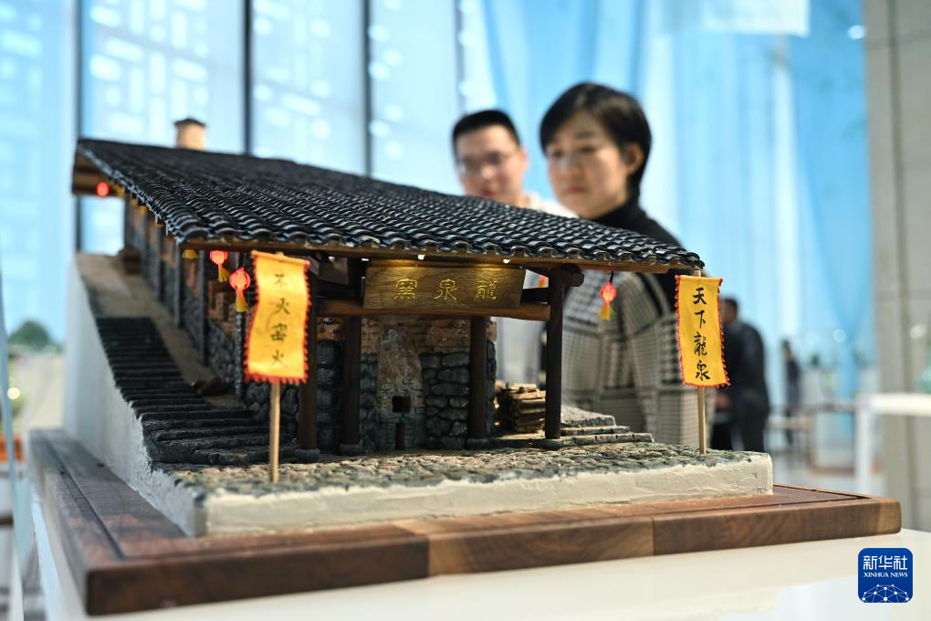 2月2日,参观者在展览上观看龙泉古窑微缩景观。