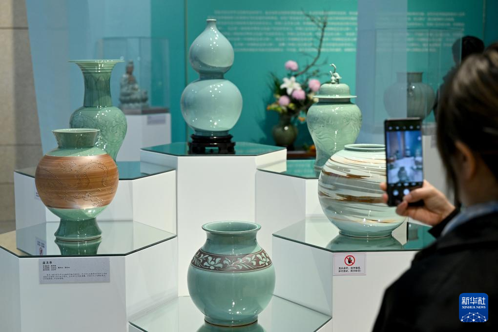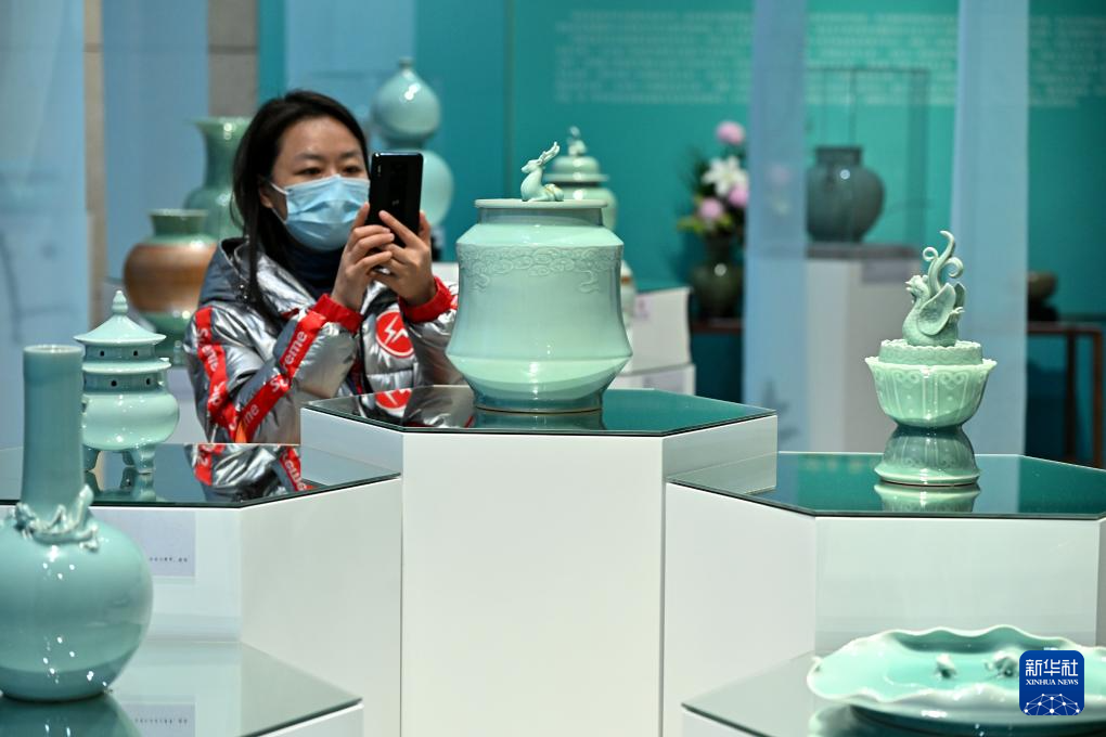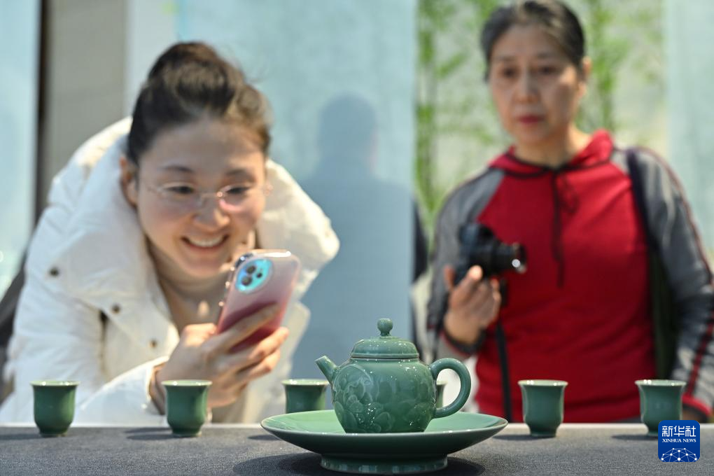 2月2日,参观者在展览上拍摄龙泉青瓷茶具。
