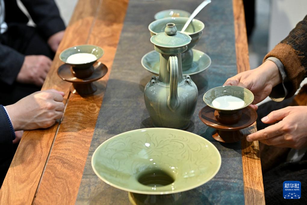 2月2日,参观者在展览上体验使用龙泉青瓷茶具。