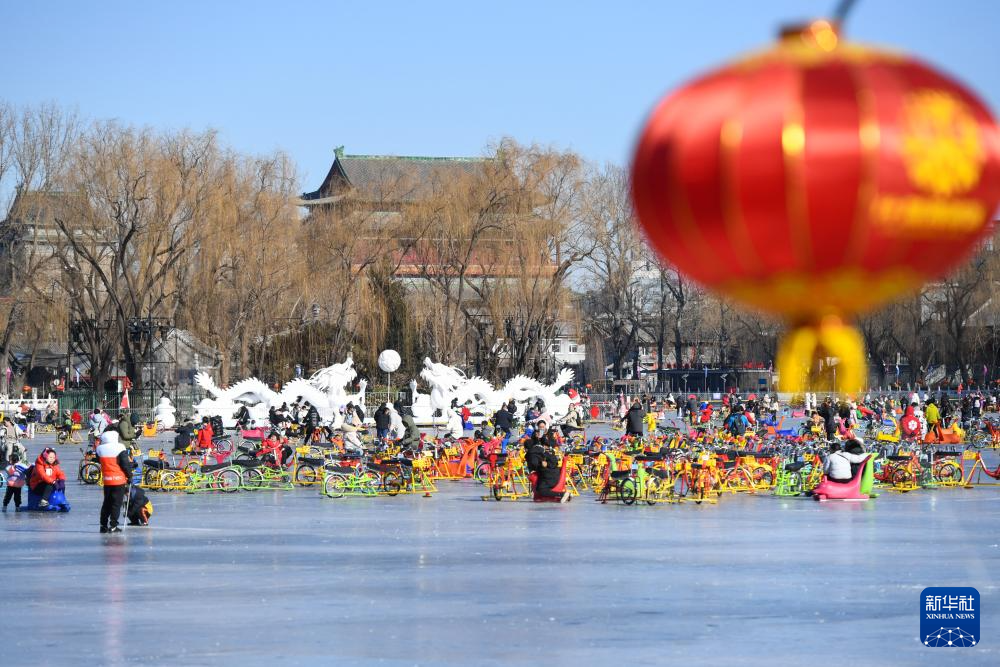 在什刹海冰场上,游客在两条龙形装饰旁滑冰(1月24日摄)。