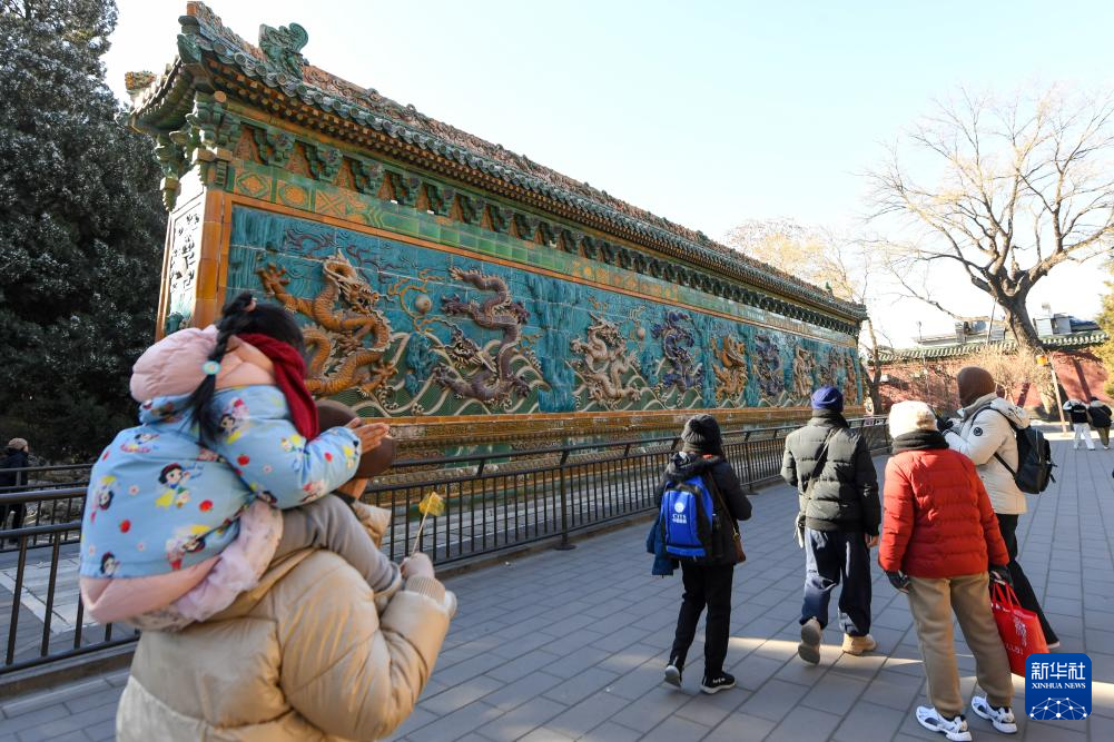 游客在北海公园内参观九龙壁(1月24日摄)。