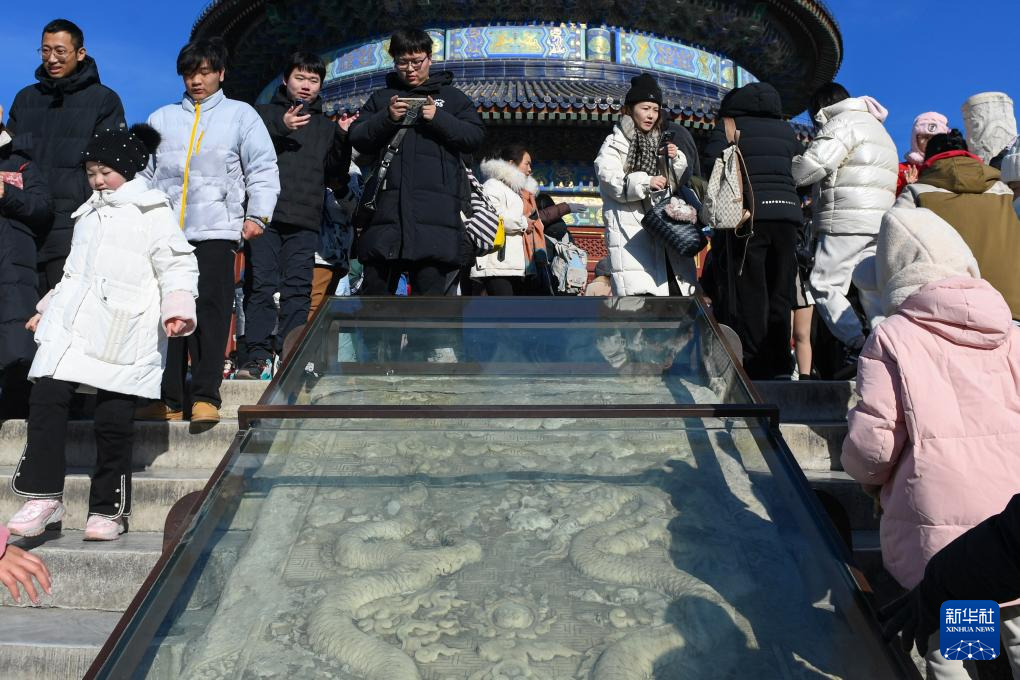 游客在天坛公园的石雕前游览参观,石雕上雕刻有两条龙的形象(1月23日摄)。
