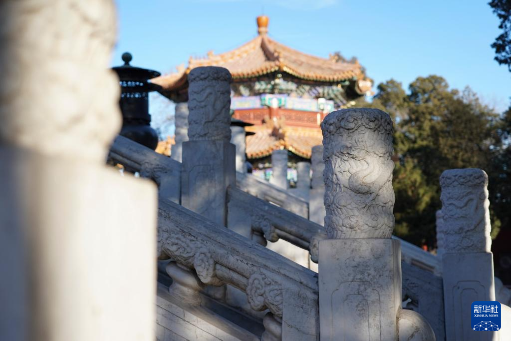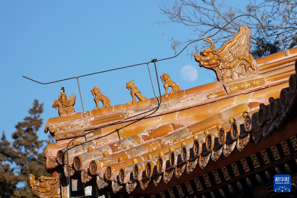 这是景山寿皇殿院内一座古建屋顶局部,最右侧的脊兽是神话传说中龙生的九子之一“嘲风”(1月23日摄)。