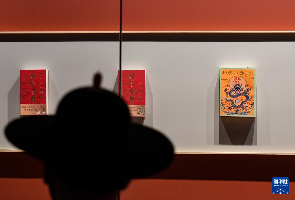 在故宫文华殿,“汇流澄鉴:故宫出版社建社四十周年展”展出了一本封面是龙形象的《故宫日历》(1月28日摄)。