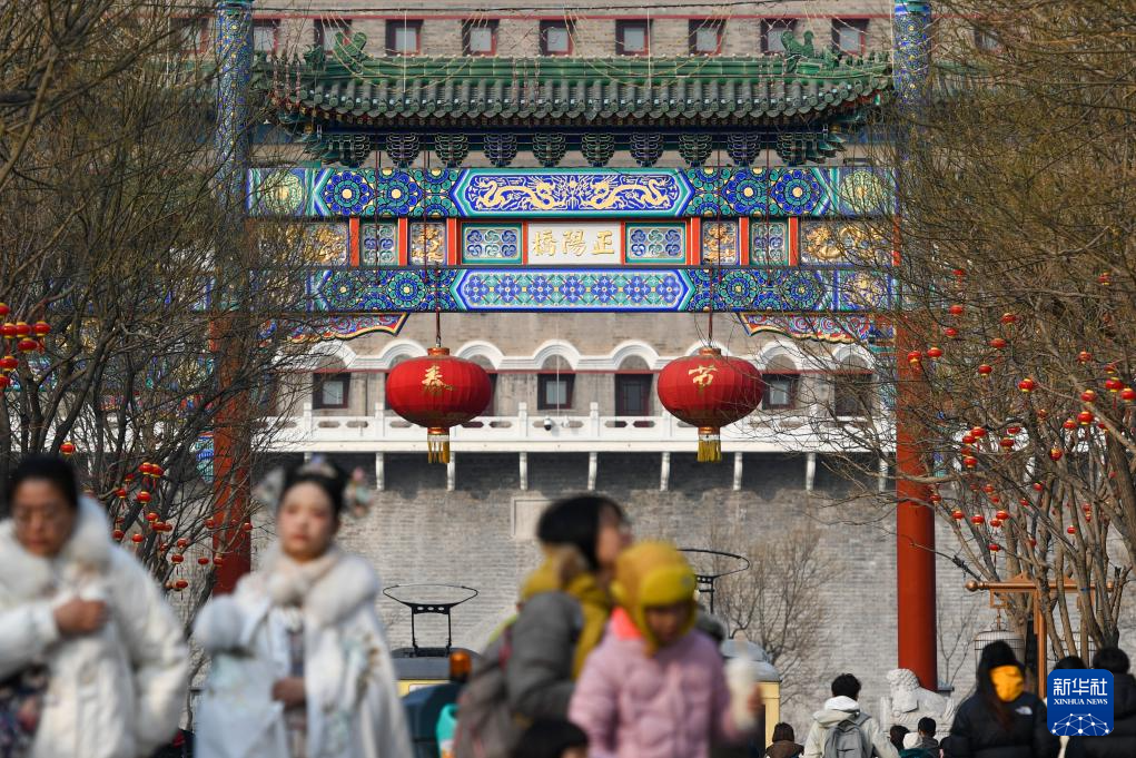 游客在前门大街参观游览,前门五牌楼上装饰有龙纹(2月5日摄)。