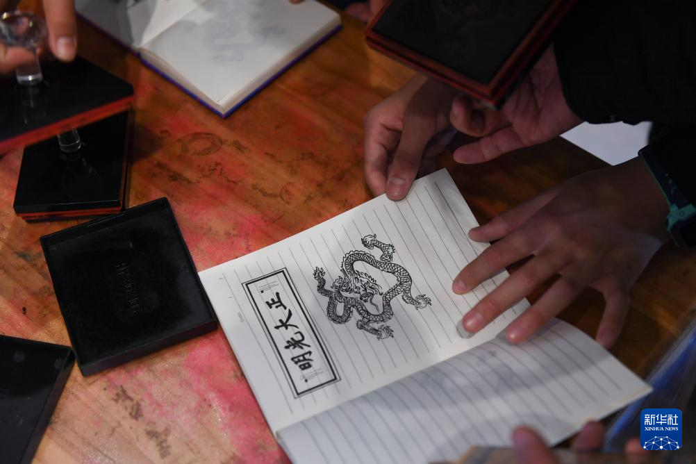 游客在故宫汉字馆盖龙形象的印章(1月28日摄)。