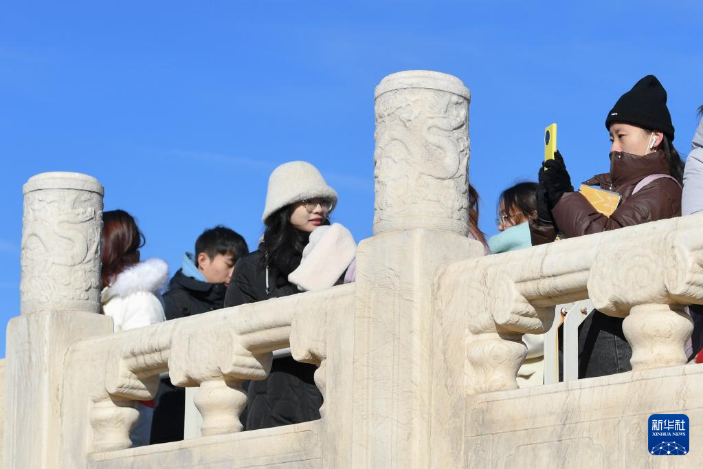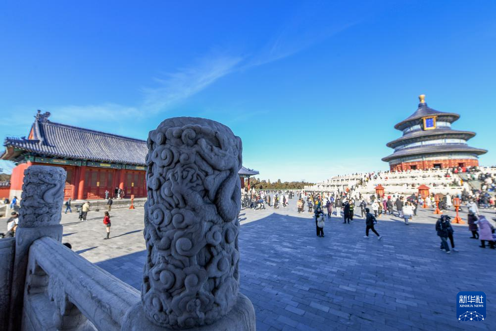 游客在天坛公园参观游览,天坛公园栏杆上雕刻有龙的形象(1月23日摄)。