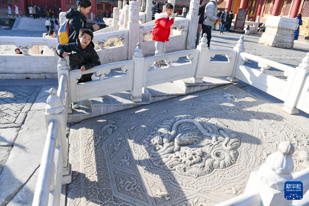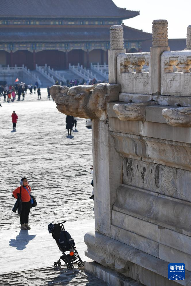 这是故宫文华殿院内一座雕有神兽“蚣蝮”的桥(1月28日摄)。在神话传说中,蚣蝮是龙生的九子之一。