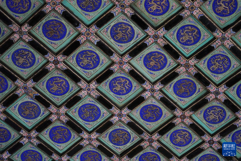 这是北京国子监辟雍殿内拍摄的团龙合玺井口式天花(1月21日摄)。北京国子监位于北京中轴线缓冲区内。