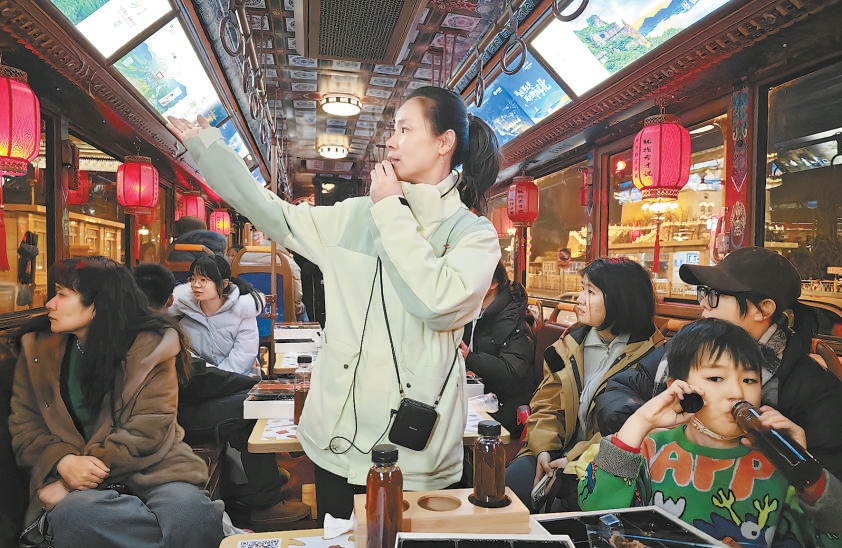 春节假期,北京旅游集散中心重新开通仿古铛铛车夜游观光专线,游客一边欣赏北京美丽璀璨的夜景,一边品尝老北京小吃,体验别样春节。记者 刘平摄