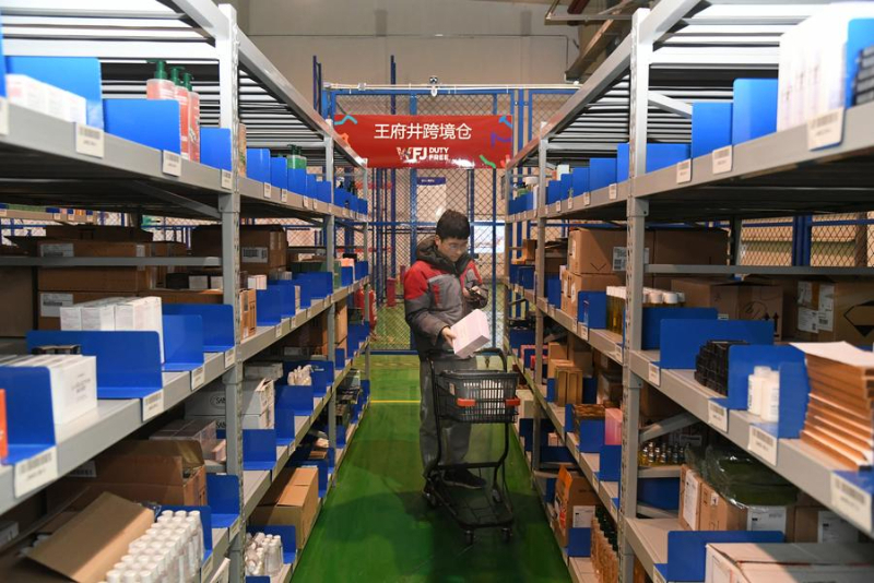 工作人员在位于北京首都机场临空经济区的王府井全球购跨境仓拣货(2月1日摄)。新华社记者 任超 摄