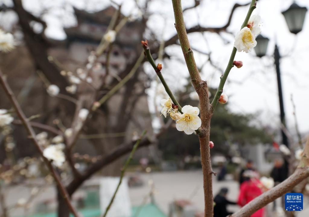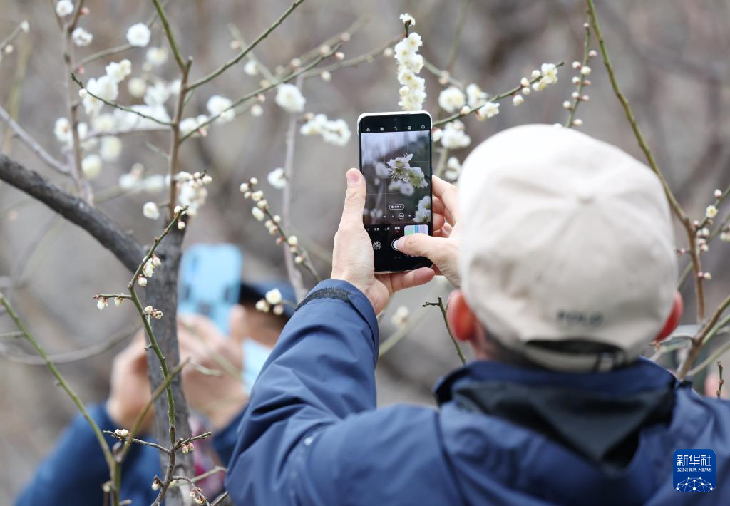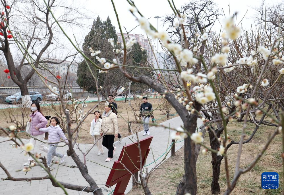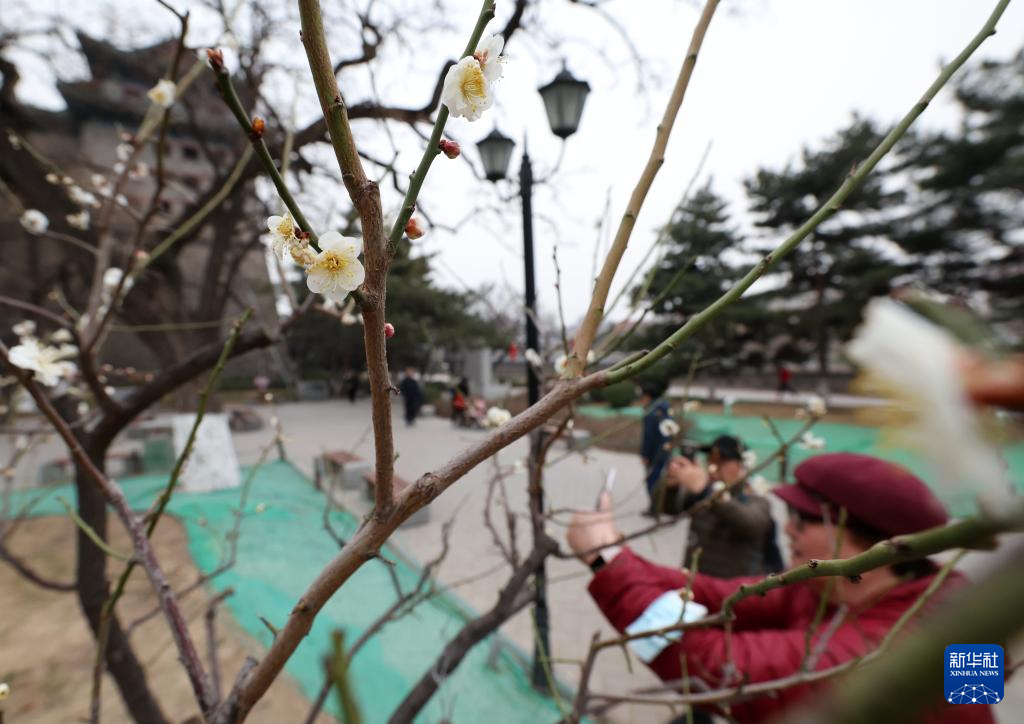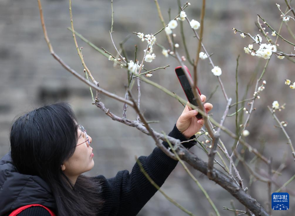 随着气温逐步升高,北京明城墙遗址公园的梅花开放,吸引游客前来赏花踏春。