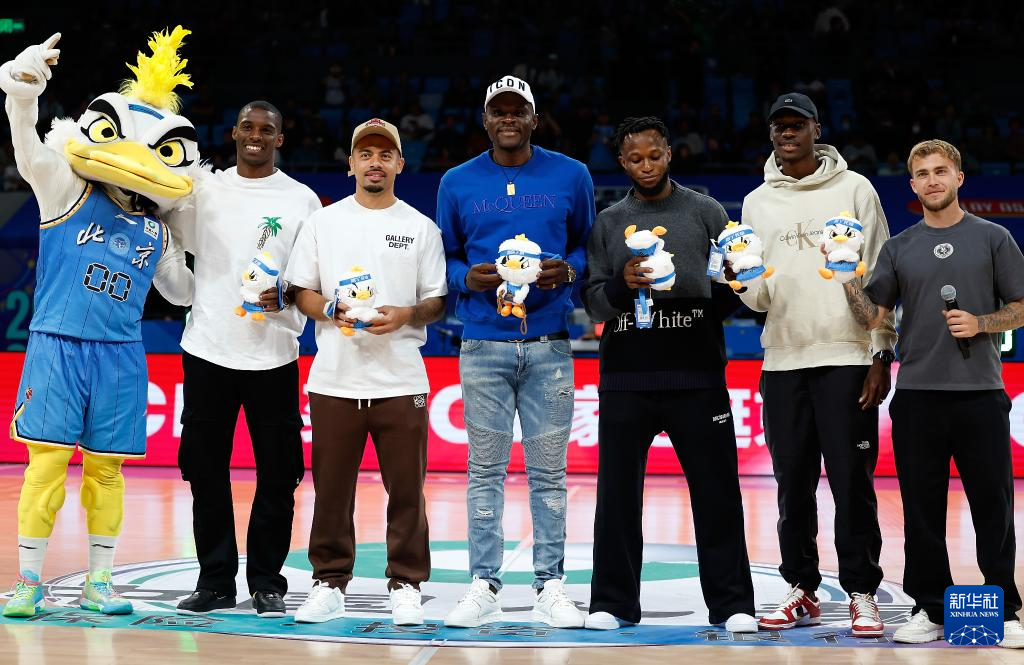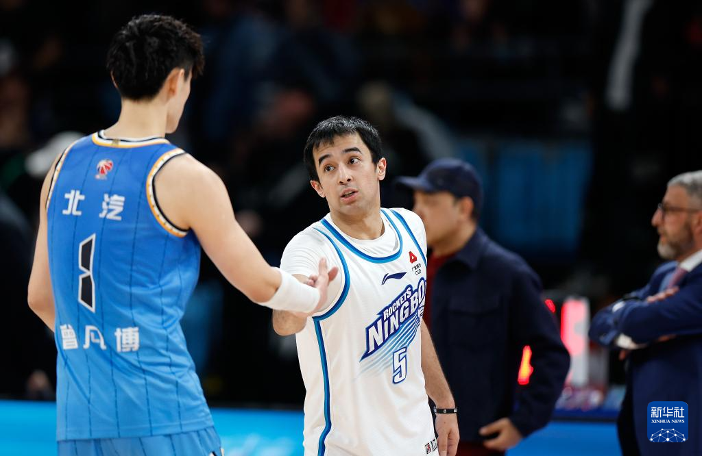 3月31日,宁波町渥队球员阿尔斯兰(左二)在比赛后与北京北汽队球员曾凡博相互致意。