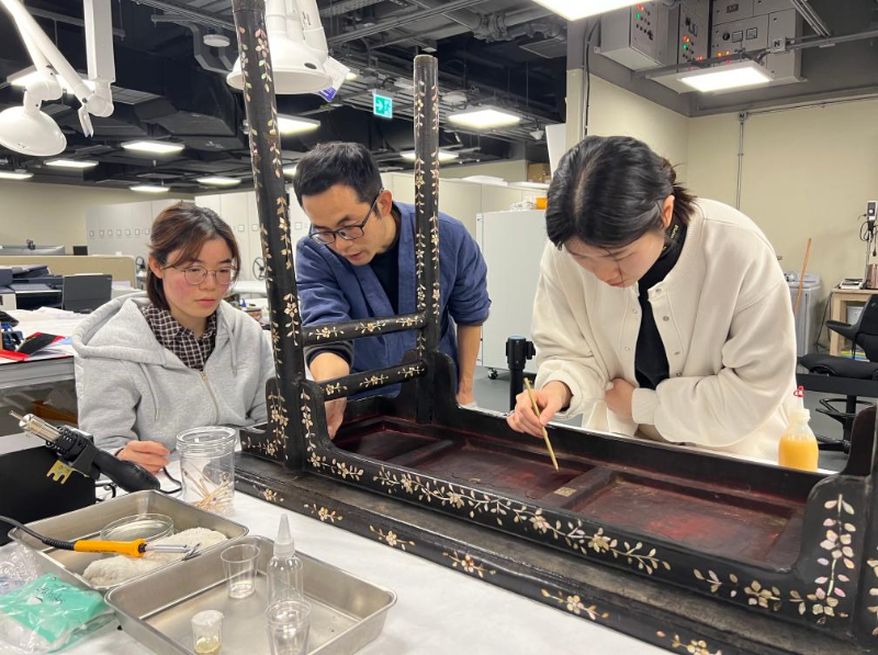这次修复的另一类文物是漆器,对于温度、湿度的变化有严格要求。“香港故宫文化博物馆在接到这件明代黑漆嵌螺钿桌案时发现,桌案不仅出现了裂缝,还有螺片的脱落与缺失。”梁嘉放说。