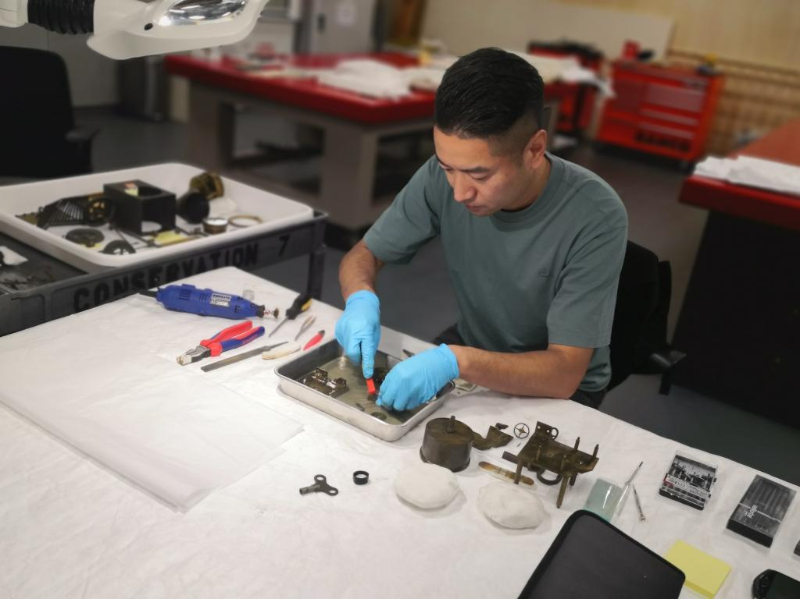 于是,香港故宫文化博物馆的修复师们开始查阅文献资料,查找可作参考的器物,要将其原貌展示给观众。而古钟表的修复不仅需要清洁除尘,还需掌握专业的钟表机械维修技术,才能准确恢复古钟表的功能。