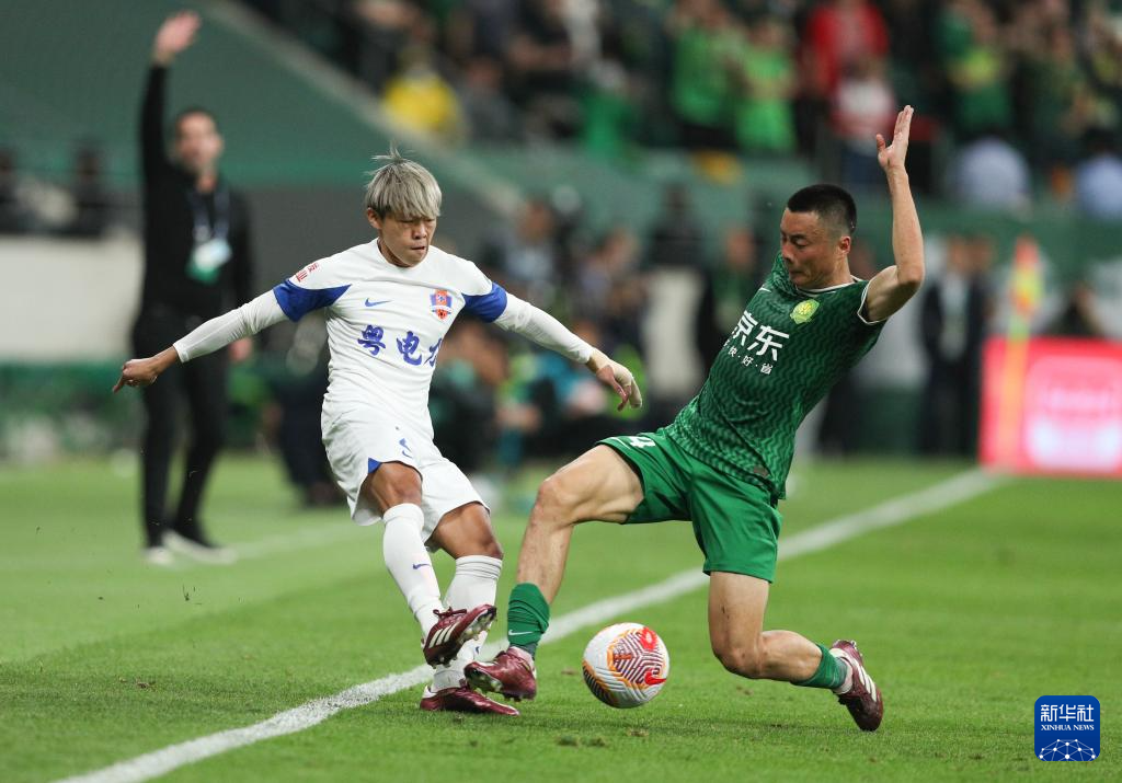 5月11日,北京国安队球员李磊(右)与梅州客家队球员茹子楠在比赛中拼抢。