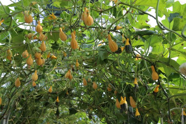南瓜棚内,每一个南瓜都极具观赏性,有的像心形,有的像狼牙棒,有的是一个盘形南瓜中叠着一个蛋糕似的小南瓜,还有的一半黄一半绿,独特形状和颜色的南瓜让人目不暇接,惊喜连连,吸引了不少游客打卡拍照。