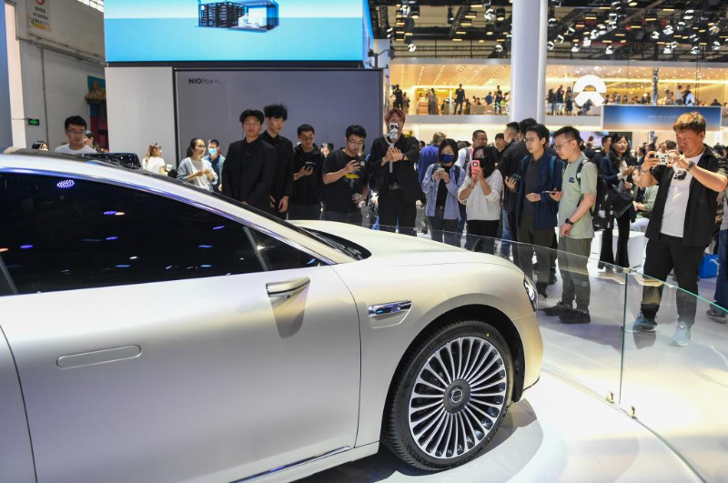 2024年4月25日,在北京中国国际展览中心顺义馆举行的2024北京车展上,参观者在参观享界S9汽车。新华社记者鞠焕宗 摄