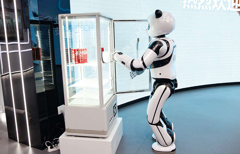 在深圳市优必选科技股份有限公司展厅内,熊猫机器人从冰柜中取出一听可乐(2024年2月29日摄) 洪泽华摄/本刊