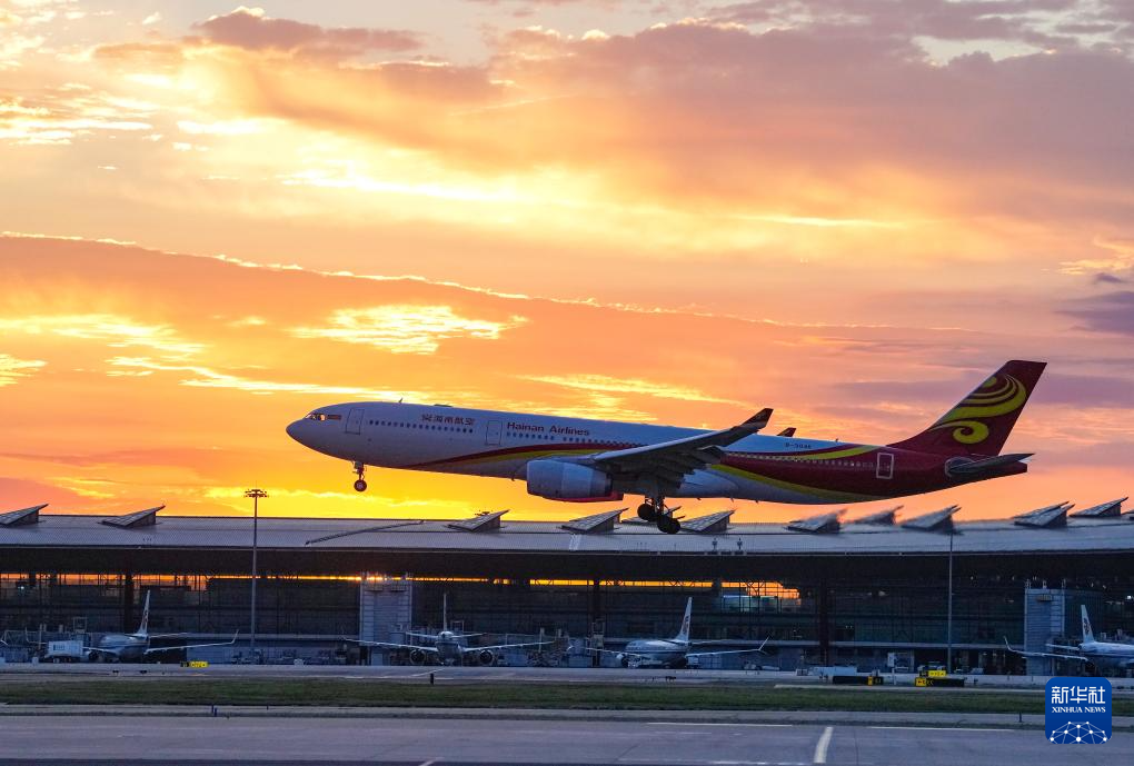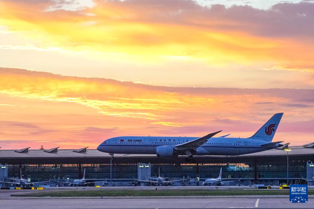 9月2日清晨,一架航班在朝霞下的北京首都国际机场降落。