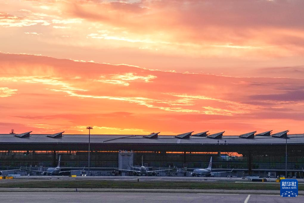 朝霞下的北京首都国际机场(9月2日摄)。