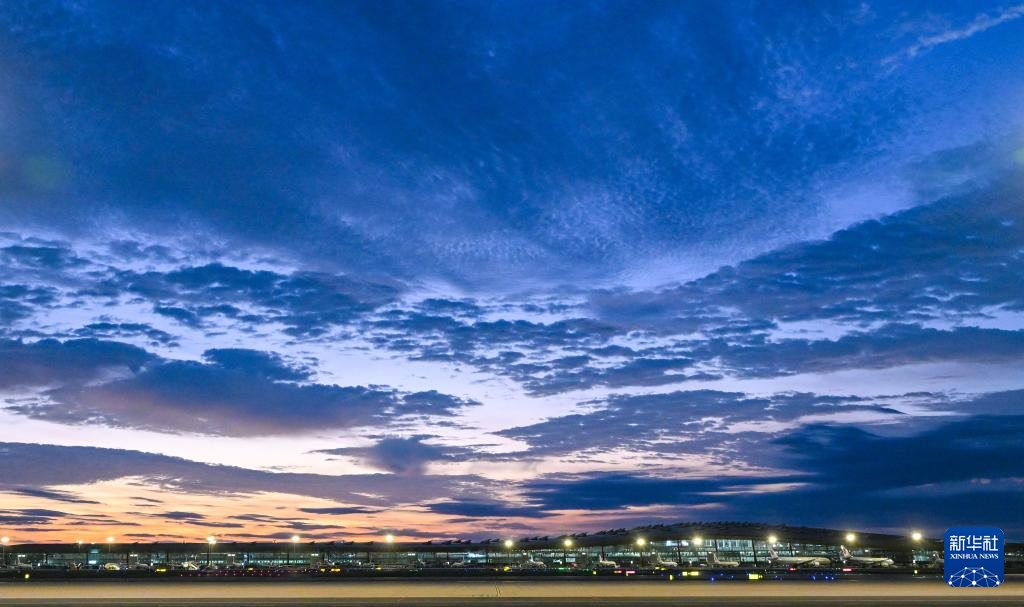 9月2日清晨在北京首都国际机场拍摄的日出前的蓝调时刻。